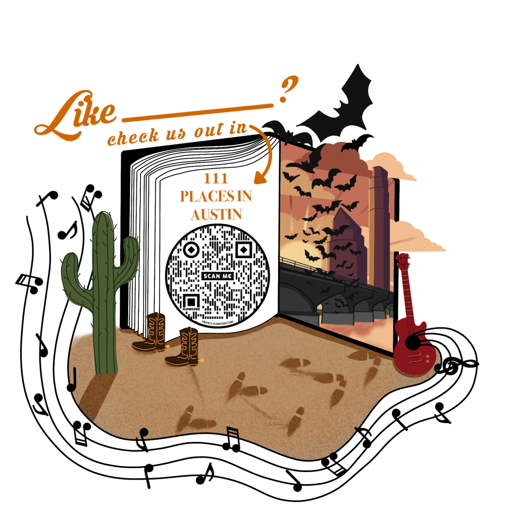 In the center is a QR code which will direct the user to the books’ page on Austin’s favorite local bookstore. This not only 0lugs the book, but one of th small businesses in the book.