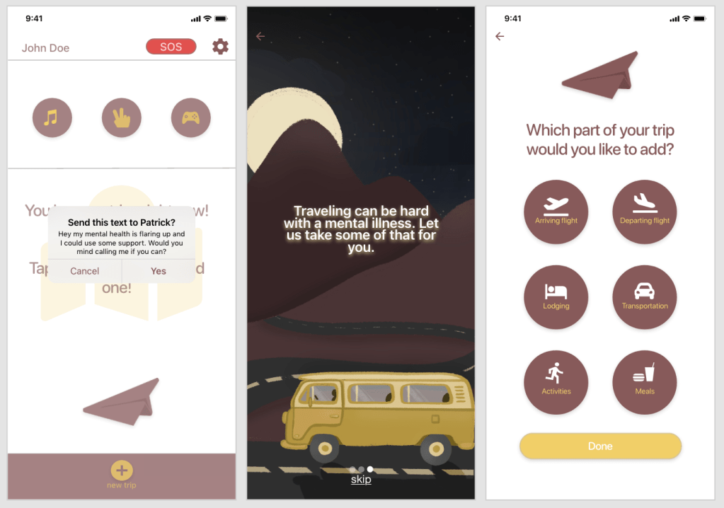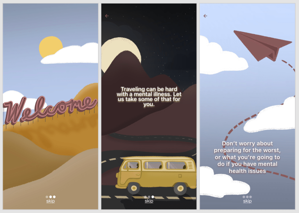 People who suffer from mental health problems want to go on vacations like everyone else but find the process of planning the trip and many modes of travel extremely taxing. The challenge was designing an app that would ease multiple symptoms for multiple mental health problems.